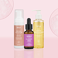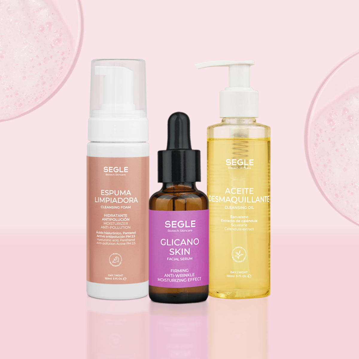 Este kit contiene una Espuma limpiadora 150ml + Aceite Desmaquillante 150ml + Glicano Skin Serum 30ml