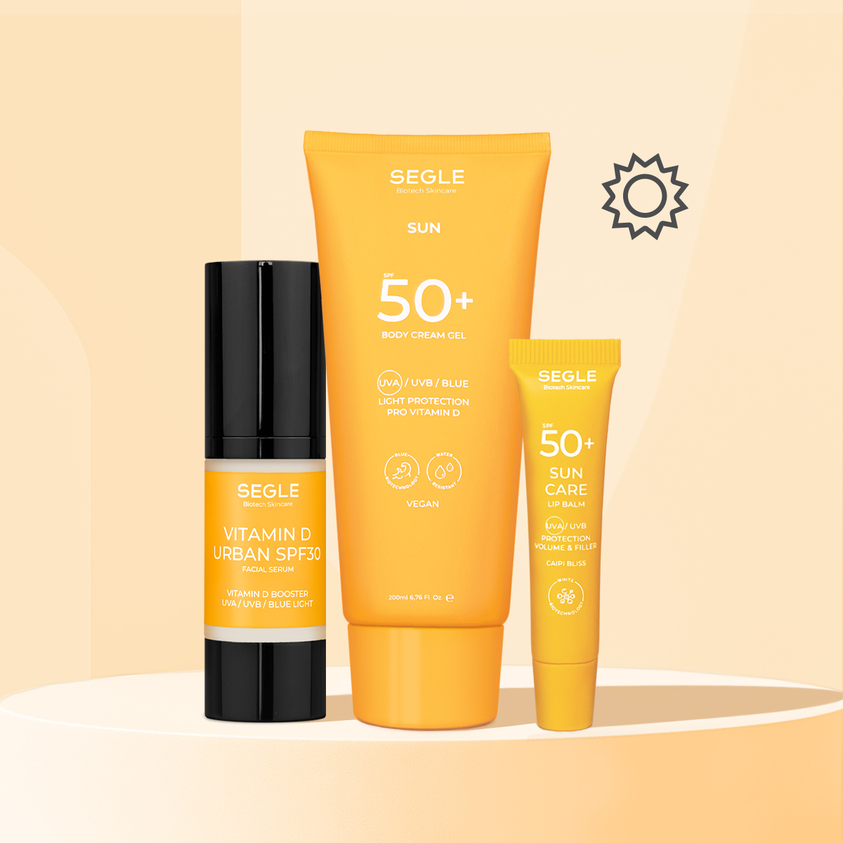 Kit completo de protección solar con Vitamin D Urban SPF30 sérum 30ml + Sun Care Cremigel Corporal SPF50 200 ml + Sun Lip Balm Caipi para que no te preocupes de nada sin importar si andas en la ciudad, la montaña o la playa.